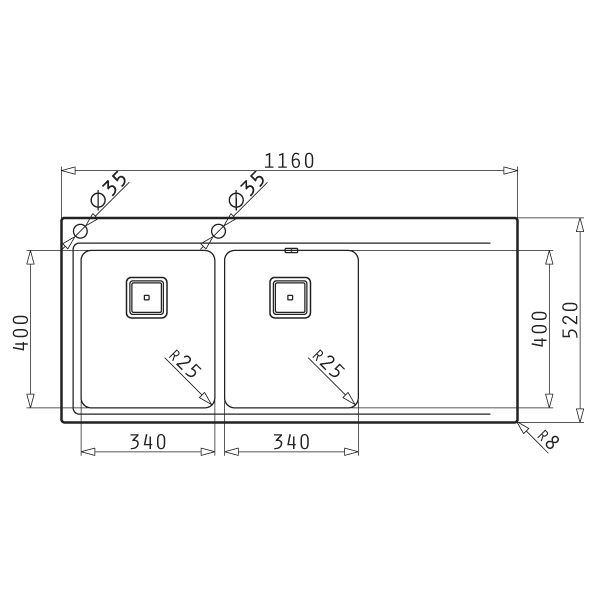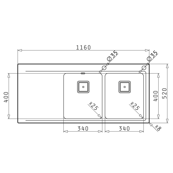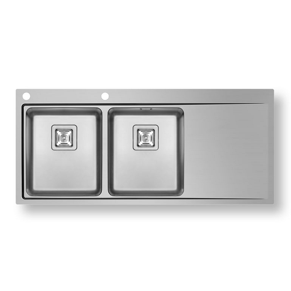 Ανοξείδωτος νεροχύτης Pyramis διαστάσεων 116x52cm της σειράς Olynthos, σε βουρτσισμένο φινίρισμα από άριστης ποιότητας ατσάλι (CrNi 18/10), τύπου AISI 304, με δύο γούρνες και ποδιά.