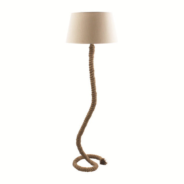 Φωτιστικό δαπέδου με μπεζ υφασμάτινο καπέλο και σκελετό από ξύλο και σχοινί.
