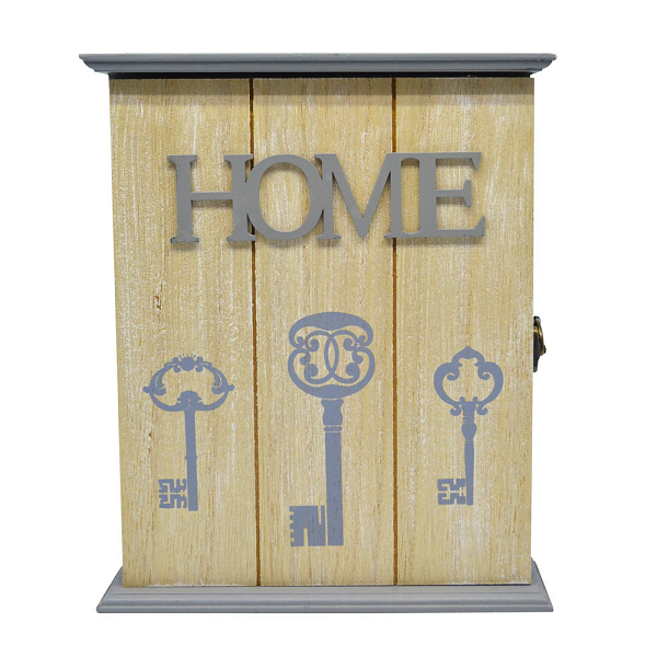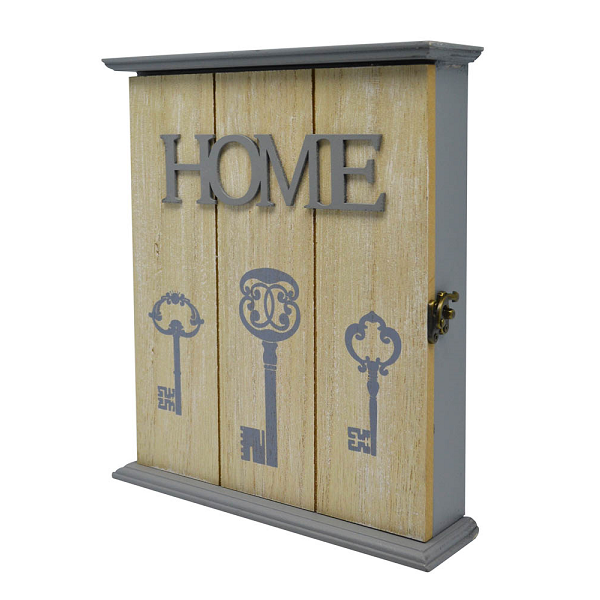 Ξύλινη κλειδοθήκη τοίχου σε φυσικό χρώμα με γκρι λεπτομέρειες, επιγραφή HOME και διακόσμηση με κλειδιά.