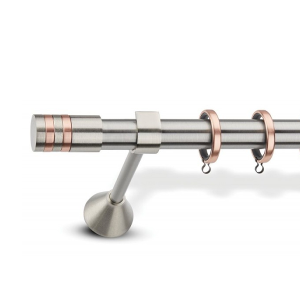 Μεταλλική ανοξείδωτη κουρτινόβεργα Enis Ματ Νίκελ/Χαλκός, A2 σε μονή βέργα, διπλή βέργα ή διπλή με σιδηρόδρομο σε διάφορες διαστάσεις. Η διάμετρος της βέργας είναι Ø25mm και περιλαμβάνει έως 3 στηρίγματα ανάλογα με την διάσταση.