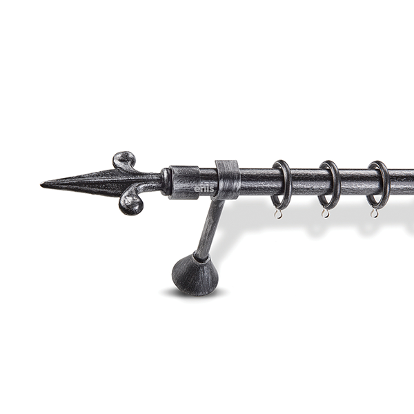 Μεταλλική κουρτινόβεργα Enis Ακόντιο σε μονή βέργα, διπλή βέργα ή διπλή με σιδηρόδρομο σε διάφορες διαστάσεις. Η διάμετρος της βέργας είναι Ø25mm και περιλαμβάνει έως 3 στηρίγματα ανάλογα με την διάσταση.