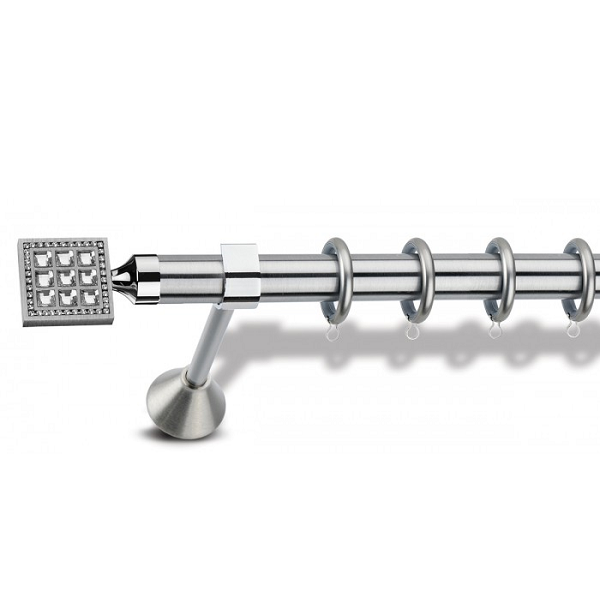 Μεταλλική ανοξείδωτη κουρτινόβεργα Enis Ματ Νίκελ, Απόλλωνας Κρύσταλλο σε μονή βέργα, διπλή βέργα ή διπλή με σιδηρόδρομο σε διάφορες διαστάσεις. Η διάμετρος της βέργας είναι Ø25mm και περιλαμβάνει έως 3 στηρίγματα ανάλογα με την διάσταση.