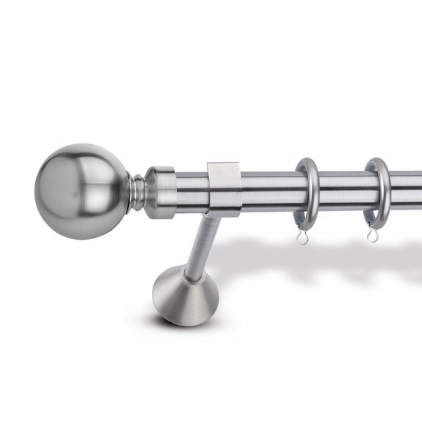 Μεταλλική ανοξείδωτη κουρτινόβεργα Enis Ματ Νίκελ, Μπάλα σε μονή βέργα, διπλή βέργα ή διπλή με σιδηρόδρομο σε διάφορες διαστάσεις. Η διάμετρος της βέργας είναι Ø25mm και περιλαμβάνει έως 3 στηρίγματα ανάλογα με την διάσταση.