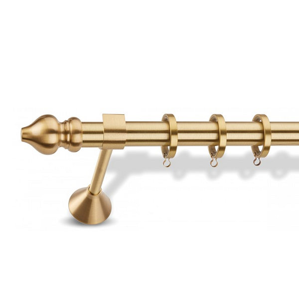 Μεταλλική κουρτινόβεργα από ορείχαλκο Enis Ματ Χρυσό, Μπαρόκο σε μονή βέργα ή διπλή με σιδηρόδρομο διαφόρων διαστάσεων. Η διάμετρος της βέργας είναι Ø25mm και περιλαμβάνει έως 3 στηρίγματα ανάλογα με την διάσταση.