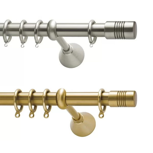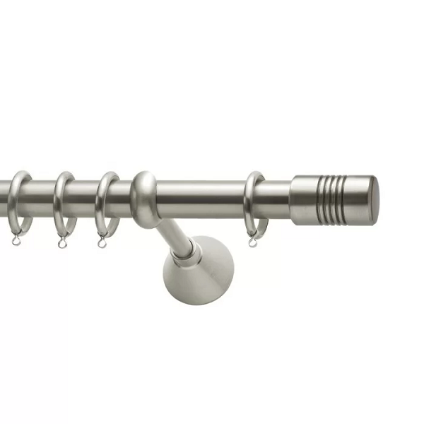 Μεταλλική ανοξείδωτη κουρτινόβεργα Viometale Bristol σε μονή βέργα, διπλή βέργα ή διπλή με σιδηρόδρομο σε διάφορες διαστάσεις. Η διάμετρος της βέργας είναι Ø25mm και περιλαμβάνει έως 3 στηρίγματα ανάλογα με την διάσταση.