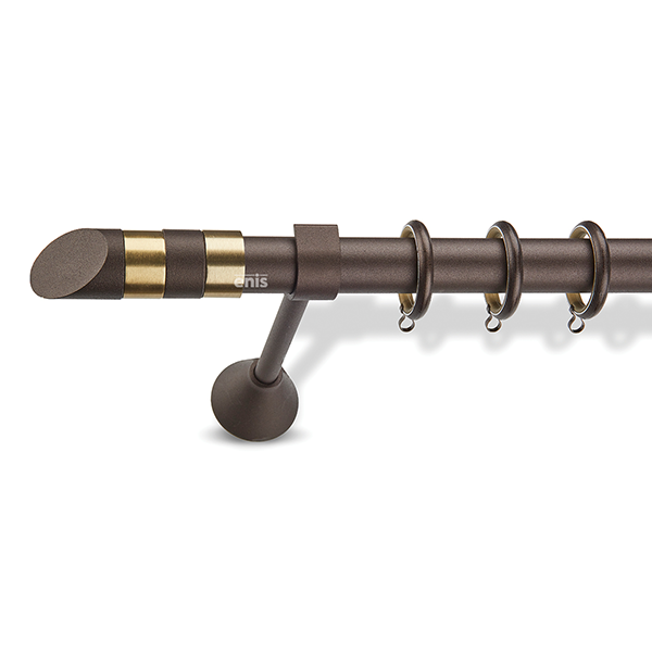 Μεταλλική κουρτινόβεργα Enis Σκουριά/Όρο, Chic 3035 σε μονή βέργα, διπλή βέργα ή διπλή με σιδηρόδρομο σε διάφορες διαστάσεις. Η διάμετρος της βέργας είναι Ø25mm και περιλαμβάνει έως 3 στηρίγματα ανάλογα με την διάσταση.