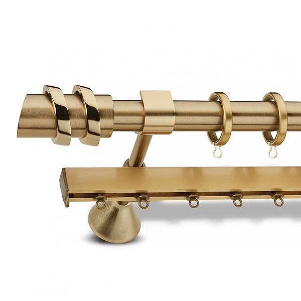 Μεταλλική ανοξείδωτη κουρτινόβεργα Enis Ματ Όρο, Δάφνη σε μονή βέργα, διπλή βέργα ή διπλή με σιδηρόδρομο σε διάφορες διαστάσεις. Η διάμετρος της βέργας είναι Ø25mm και περιλαμβάνει έως 3 στηρίγματα ανάλογα με την διάσταση.