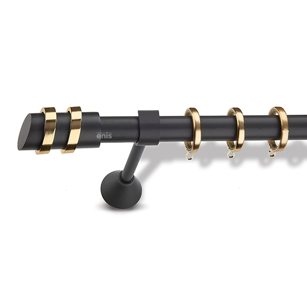 Μεταλλική κουρτινόβεργα Enis Δάφνη με κρίκους όρο και μεταλλικές όρο λεπτομέρειες στο άκρο, σε μονή βέργα, διπλή βέργα ή διπλή με σιδηρόδρομο σε διάφορες διαστάσεις. Η διάμετρος της βέργας είναι Ø25mm και περιλαμβάνει έως 3 στηρίγματα ανάλογα με την διάσταση.