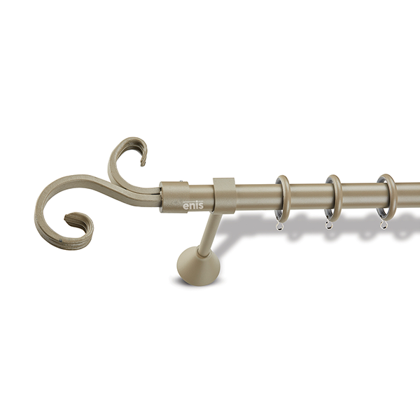 Μεταλλική κουρτινόβεργα Enis Δαίδαλος σε μονή βέργα, διπλή βέργα ή διπλή με σιδηρόδρομο σε διάφορες διαστάσεις. Η διάμετρος της βέργας είναι Ø25mm και περιλαμβάνει έως 3 στηρίγματα ανάλογα με την διάσταση.
