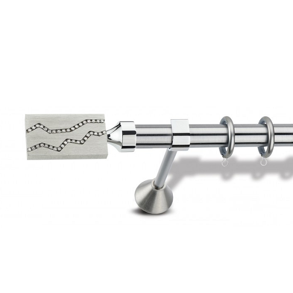 Μεταλλική ανοξείδωτη κουρτινόβεργα Enis Ματ Νίκελ/Χρώμιο, Δανάη Strass σε μονή βέργα, διπλή βέργα ή διπλή με σιδηρόδρομο σε διάφορες διαστάσεις. Η διάμετρος της βέργας είναι Ø25mm και περιλαμβάνει έως 3 στηρίγματα ανάλογα με την διάσταση.