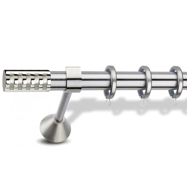 Μεταλλική ανοξείδωτη κουρτινόβεργα Enis Ματ Νίκελ/Χρώμιο, Εκάβη Στρογγυλό σε μονή βέργα, διπλή βέργα ή διπλή με σιδηρόδρομο σε διάφορες διαστάσεις. Η διάμετρος της βέργας είναι Ø25mm και περιλαμβάνει έως 3 στηρίγματα ανάλογα με την διάσταση.