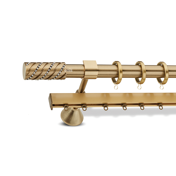 Μεταλλική ανοξείδωτη κουρτινόβεργα Enis Ματ Όρο, Ελεονώρα 3 σε μονή βέργα, διπλή βέργα ή διπλή με σιδηρόδρομο σε διάφορες διαστάσεις. Η διάμετρος της βέργας είναι Ø25mm και περιλαμβάνει έως 3 στηρίγματα ανάλογα με την διάσταση.