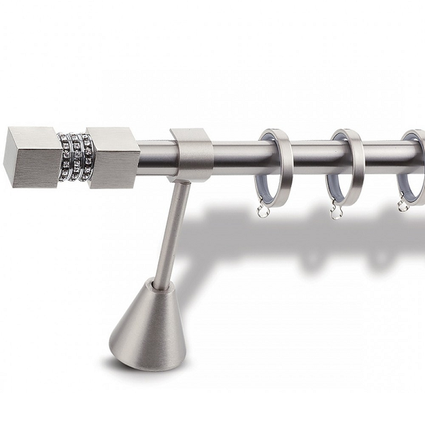 Μεταλλική κουρτινόβεργα Enis Ερατώ 3 σε μονή βέργα διαφόρων διαστάσεων. Η διάμετρος της βέργας είναι Ø20mm και περιλαμβάνει έως 3 στηρίγματα ανάλογα με την διάσταση.