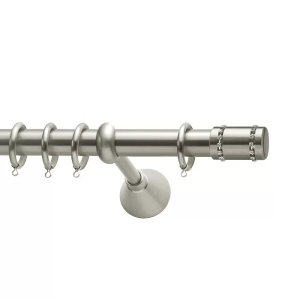 Μεταλλική ανοξείδωτη κουρτινόβεργα Viometale Florida σε μονή βέργα, διπλή βέργα ή διπλή με σιδηρόδρομο σε διάφορες διαστάσεις. Η διάμετρος της βέργας είναι Ø25mm και περιλαμβάνει έως 3 στηρίγματα ανάλογα με την διάσταση.