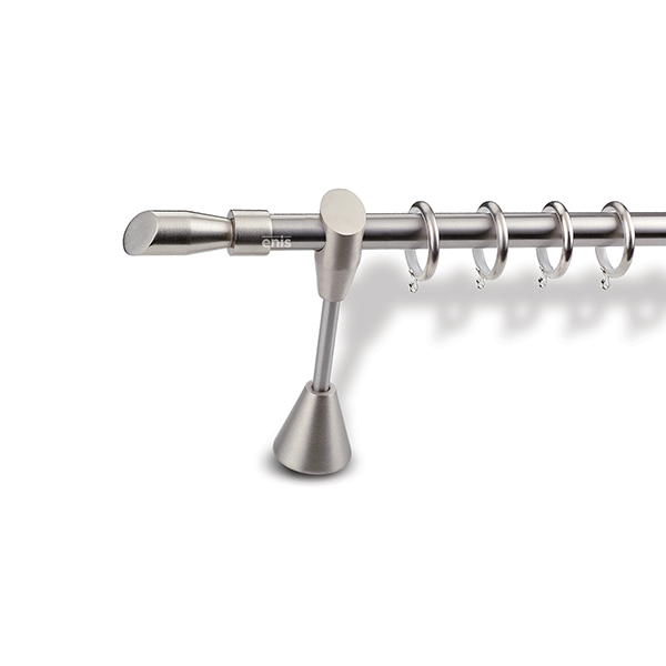 Μεταλλική ανοξείδωτη κουρτινόβεργα Enis Ματ Νίκελ ή Αντικέ, Ερμής σε μονή βέργα διαφόρων διαστάσεων. Η διάμετρος της βέργας είναι Ø16mm και περιλαμβάνει έως 3 στηρίγματα ανάλογα με την διάσταση.