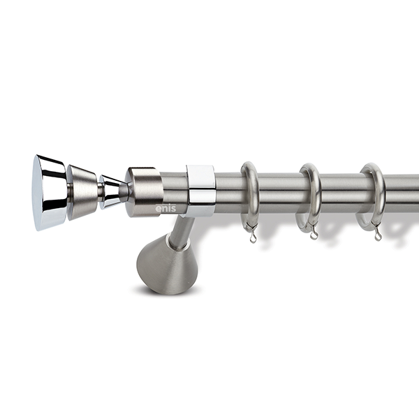 Μεταλλική ανοξείδωτη κουρτινόβεργα Enis Ίος σε μονή βέργα διαφόρων διαστάσεων. Η διάμετρος της βέργας είναι Ø35mm και περιλαμβάνει έως 3 στηρίγματα ανάλογα με την διάσταση.