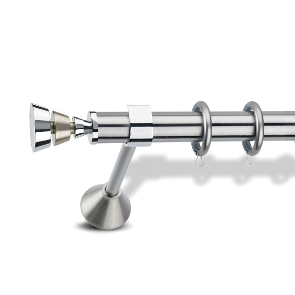 Μεταλλική ανοξείδωτη κουρτινόβεργα Enis Ματ Νίκελ, Ίος σε μονή βέργα, διπλή βέργα ή διπλή με σιδηρόδρομο σε διάφορες διαστάσεις. Η διάμετρος της βέργας είναι Ø25mm και περιλαμβάνει έως 3 στηρίγματα ανάλογα με την διάσταση.