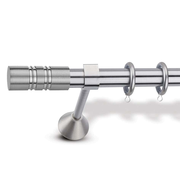 Μεταλλική ανοξείδωτη κουρτινόβεργα Enis Ματ Νίκελ, Ισμήνη σε μονή βέργα, διπλή βέργα ή διπλή με σιδηρόδρομο σε διάφορες διαστάσεις. Η διάμετρος της βέργας είναι Ø25mm και περιλαμβάνει έως 3 στηρίγματα ανάλογα με την διάσταση.