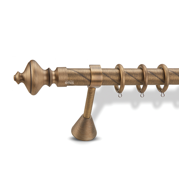 Μεταλλική ανοξείδωτη κουρτινόβεργα Enis Καναλάζ σε στριφτή μονή βέργα διαφόρων διαστάσεων. Η διάμετρος της βέργας είναι Ø35mm και περιλαμβάνει έως 3 στηρίγματα ανάλογα με την διάσταση.