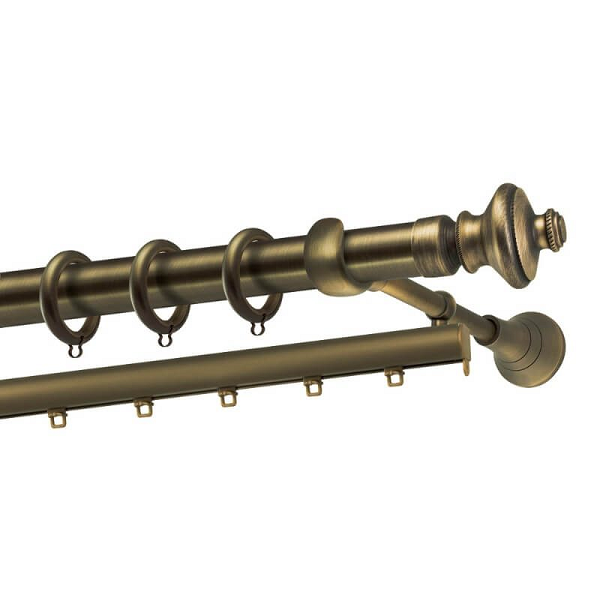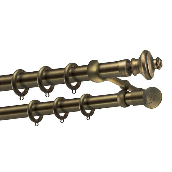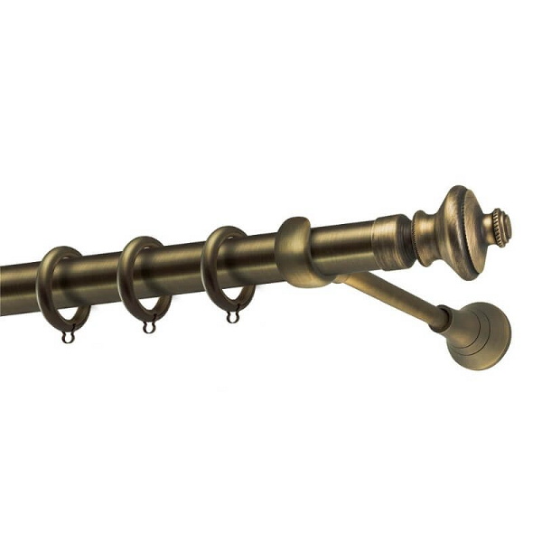 Μεταλλική κουρτινόβεργα Κέα της εταιρείας Perfect, χρώματος Μπρονζέ, σε μονή βέργα, διπλή βέργα ή διπλή με σιδηρόδρομο σε διάφορες διαστάσεις. Η διάμετρος της βέργας είναι Ø25mm και περιλαμβάνει έως 3 στηρίγματα ανάλογα με την διάσταση.