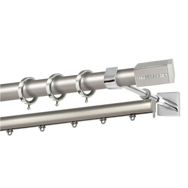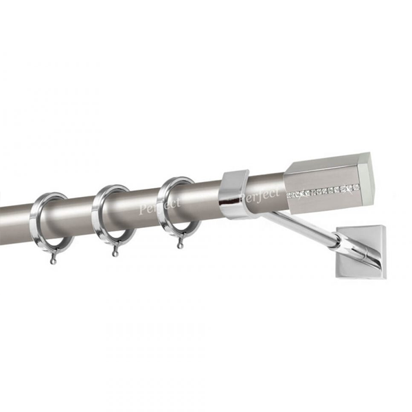Μεταλλική κουρτινόβεργα Κέρκυρα Strass της εταιρείας Perfect, χρώματος Ματ Νίκελ, σε μονή βέργα, διπλή βέργα ή διπλή με σιδηρόδρομο σε διάφορες διαστάσεις. Η διάμετρος της βέργας είναι Ø25mm και περιλαμβάνει έως 3 στηρίγματα ανάλογα με την διάσταση.