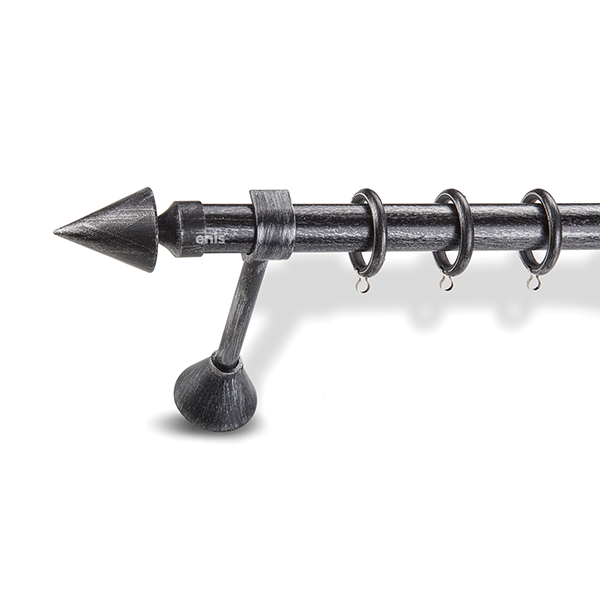 Μεταλλική κουρτινόβεργα Enis Κώνος σε μονή βέργα, διπλή βέργα ή διπλή με σιδηρόδρομο σε διάφορες διαστάσεις. Η διάμετρος της βέργας είναι Ø25mm και περιλαμβάνει έως 3 στηρίγματα ανάλογα με την διάσταση.
