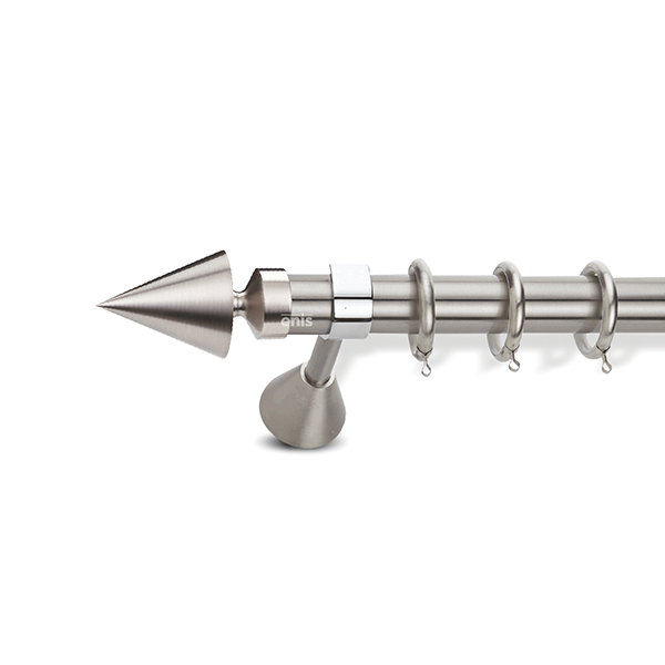Μεταλλική ανοξείδωτη κουρτινόβεργα Enis Κώνος σε μονή βέργα διαφόρων διαστάσεων. Η διάμετρος της βέργας είναι Ø35mm και περιλαμβάνει έως 3 στηρίγματα ανάλογα με την διάσταση.