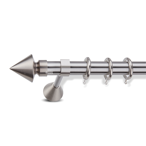 Μεταλλική ανοξείδωτη κουρτινόβεργα Enis Κώνος σε μονή βέργα διαφόρων διαστάσεων. Η διάμετρος της βέργας είναι Ø35mm και περιλαμβάνει έως 3 στηρίγματα ανάλογα με την διάσταση.