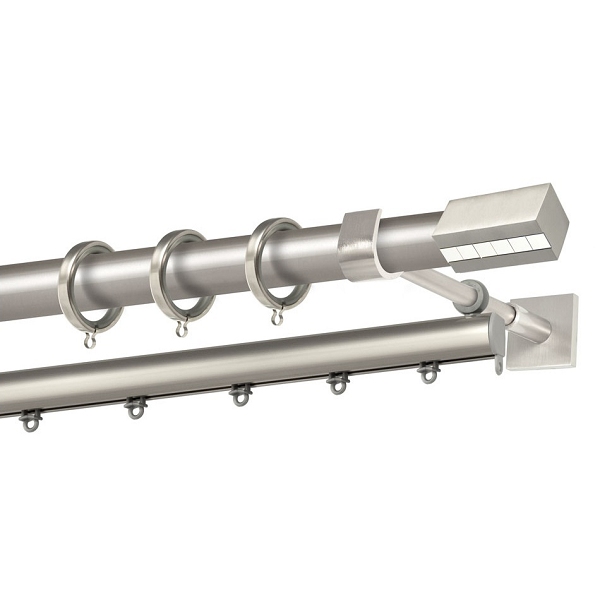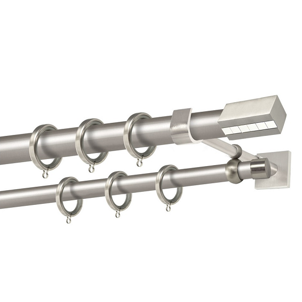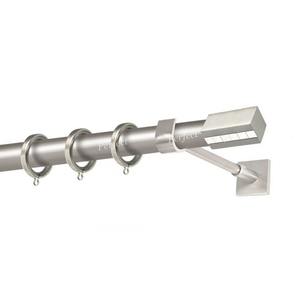 Μεταλλική κουρτινόβεργα Κως της εταιρείας Perfect, χρώματος Ματ Νίκελ/Χρώμιο, σε μονή βέργα, διπλή βέργα ή διπλή με σιδηρόδρομο σε διάφορες διαστάσεις. Η διάμετρος της βέργας είναι Ø25mm και περιλαμβάνει έως 3 στηρίγματα ανάλογα με την διάσταση.