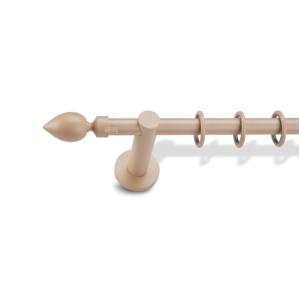 Μεταλλική κουρτινόβεργα Enis Λεμόνι σε μονή βέργα, διπλή βέργα ή διπλή με σιδηρόδρομο σε διάφορες διαστάσεις. Η διάμετρος της βέργας είναι Ø20mm και περιλαμβάνει έως 3 στηρίγματα ανάλογα με την διάσταση.