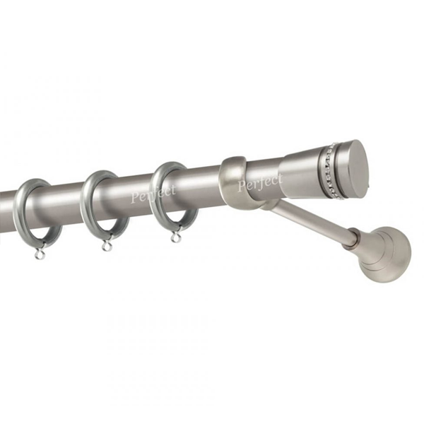 Μεταλλική κουρτινόβεργα Αμοργός Strass της εταιρείας Perfect, χρώματος Ματ Νίκελ, σε μονή βέργα, διπλή βέργα ή διπλή με σιδηρόδρομο σε διάφορες διαστάσεις. Η διάμετρος της βέργας είναι Ø25mm και περιλαμβάνει έως 3 στηρίγματα ανάλογα με την διάσταση.