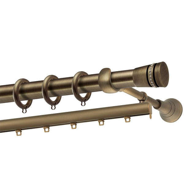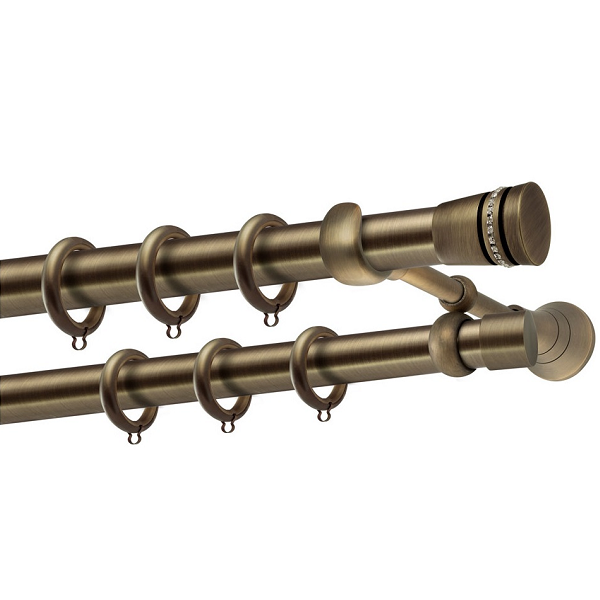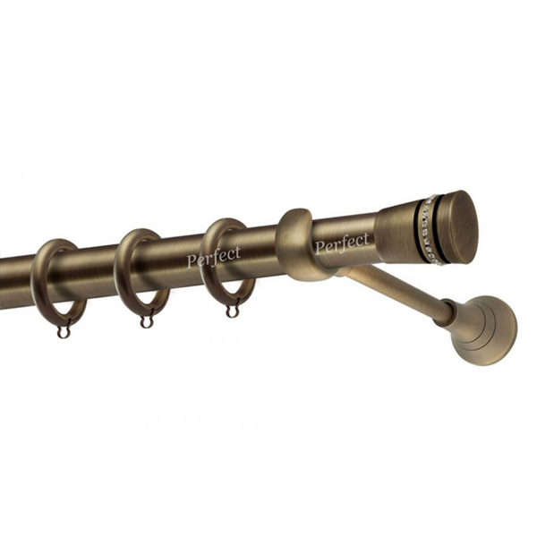 Μεταλλική κουρτινόβεργα Αμοργός Strass της εταιρείας Perfect, χρώματος Μπρονζέ, σε μονή βέργα, διπλή βέργα ή διπλή με σιδηρόδρομο σε διάφορες διαστάσεις. Η διάμετρος της βέργας είναι Ø25mm και περιλαμβάνει έως 3 στηρίγματα ανάλογα με την διάσταση.