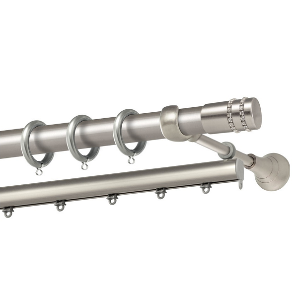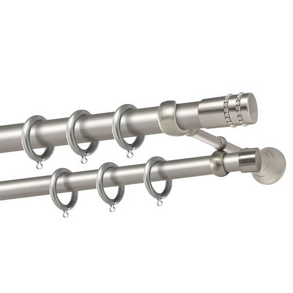 Μεταλλική κουρτινόβεργα Λέσβος Strass της εταιρείας Perfect, χρώματος Ματ Νίκελ, σε μονή βέργα, διπλή βέργα ή διπλή με σιδηρόδρομο σε διάφορες διαστάσεις. Η διάμετρος της βέργας είναι Ø25mm και περιλαμβάνει έως 3 στηρίγματα ανάλογα με την διάσταση.