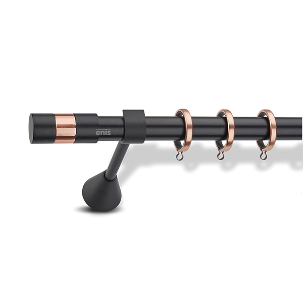 Μεταλλική κουρτινόβεργα Enis Monika σε μονή βέργα, διπλή βέργα ή διπλή με σιδηρόδρομο σε διάφορες διαστάσεις. Η διάμετρος της βέργας είναι Ø25mm και περιλαμβάνει έως 3 στηρίγματα ανάλογα με την διάσταση.