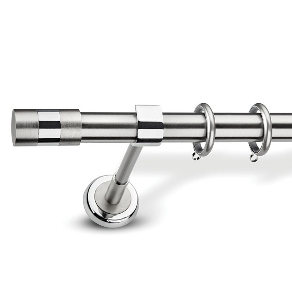 Μεταλλική ανοξείδωτη κουρτινόβεργα Enis Ματ Νίκελ/Χρώμιο, Μόνικα με στήριγμα Ρόδος σε μονή βέργα ή διπλή με σιδηρόδρομο σε διάφορες διαστάσεις. Η διάμετρος της βέργας είναι Ø25mm και περιλαμβάνει έως 3 στηρίγματα ανάλογα με την διάσταση.