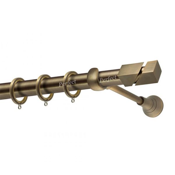 Μεταλλική κουρτινόβεργα Μύκονος της εταιρείας Perfect, χρώματος Μπρονζέ, σε μονή βέργα, διπλή βέργα ή διπλή με σιδηρόδρομο σε διάφορες διαστάσεις. Η διάμετρος της βέργας είναι Ø25mm και περιλαμβάνει έως 3 στηρίγματα ανάλογα με την διάσταση.