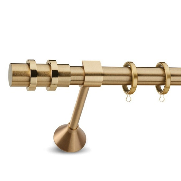 Μεταλλική ανοξείδωτη κουρτινόβεργα Enis Ματ Όρο, Οία σε μονή βέργα, διπλή βέργα ή διπλή με σιδηρόδρομο σε διάφορες διαστάσεις. Η διάμετρος της βέργας είναι Ø25mm και περιλαμβάνει έως 3 στηρίγματα ανάλογα με την διάσταση.