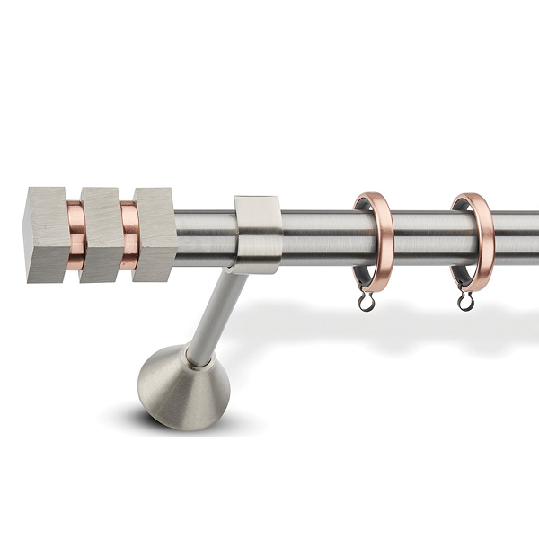 Μεταλλική ανοξείδωτη κουρτινόβεργα Enis Ματ Νίκελ/Χαλκός, Ολυμπία σε μονή βέργα, διπλή βέργα ή διπλή με σιδηρόδρομο σε διάφορες διαστάσεις. Η διάμετρος της βέργας είναι Ø25mm και περιλαμβάνει έως 3 στηρίγματα ανάλογα με την διάσταση.