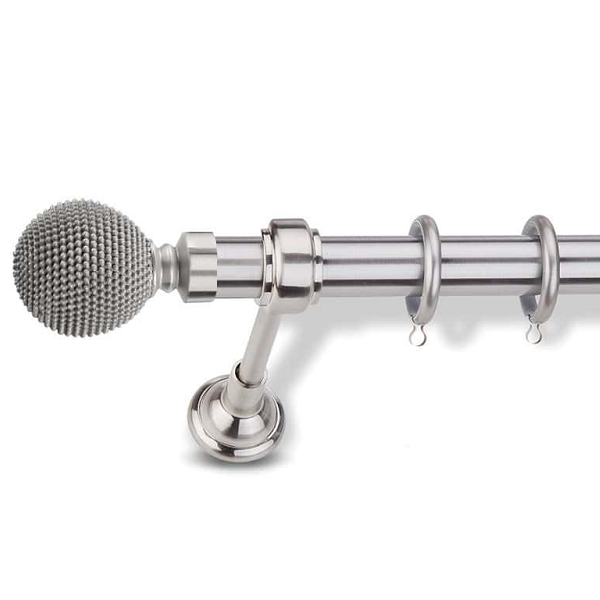 Μεταλλική ανοξείδωτη κουρτινόβεργα Enis Ματ Νίκελ, Orient της σειράς Eco σε μονή βέργα, διπλή βέργα ή διπλή με σιδηρόδρομο σε διάφορες διαστάσεις. Η διάμετρος της βέργας είναι Ø25mm και περιλαμβάνει έως 3 στηρίγματα ανάλογα με την διάσταση.