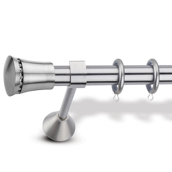 Μεταλλική ανοξείδωτη κουρτινόβεργα Enis Ματ Νίκελ, Πάργα με Καδένα σε μονή βέργα, διπλή βέργα ή διπλή με σιδηρόδρομο σε διάφορες διαστάσεις. Η διάμετρος της βέργας είναι Ø25mm και περιλαμβάνει έως 3 στηρίγματα ανάλογα με την διάσταση.