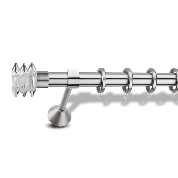 Μεταλλική ανοξείδωτη κουρτινόβεργα Enis Ματ Νίκελ, Παρνασσός Κρύσταλλο σε μονή βέργα, διπλή βέργα ή διπλή με σιδηρόδρομο σε διάφορες διαστάσεις. Η διάμετρος της βέργας είναι Ø25mm και περιλαμβάνει έως 3 στηρίγματα ανάλογα με την διάσταση.