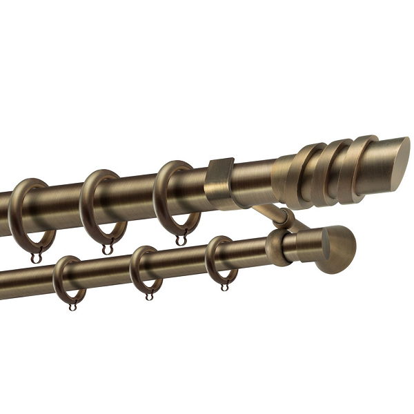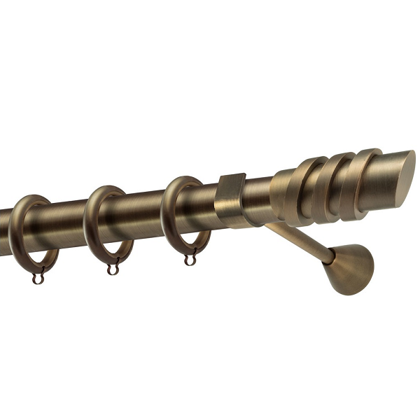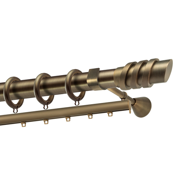 Μεταλλική κουρτινόβεργα Πάρος της εταιρείας Perfect, χρώματος Μπρονζέ, σε μονή βέργα, διπλή βέργα ή διπλή με σιδηρόδρομο σε διάφορες διαστάσεις. Η διάμετρος της βέργας είναι Ø35mm και περιλαμβάνει έως 3 στηρίγματα ανάλογα με την διάσταση.