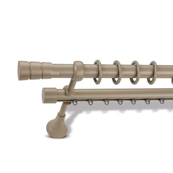 Μεταλλική κουρτινόβεργα Enis Πάρος σε διπλή βέργα με κονταροσιδηρόδρομο σε διάφορες διαστάσεις. Η διάμετρος της βέργας είναι Ø25mm και περιλαμβάνει έως 3 στηρίγματα ανάλογα με την διάσταση.