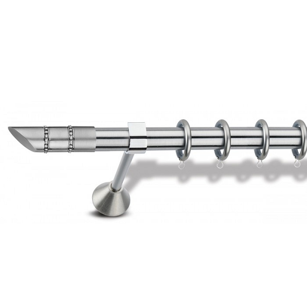 Μεταλλική ανοξείδωτη κουρτινόβεργα Enis Ματ Νίκελ, Πάτμος Strass σε μονή βέργα, διπλή βέργα ή διπλή με σιδηρόδρομο σε διάφορες διαστάσεις. Η διάμετρος της βέργας είναι Ø25mm και περιλαμβάνει έως 3 στηρίγματα ανάλογα με την διάσταση.