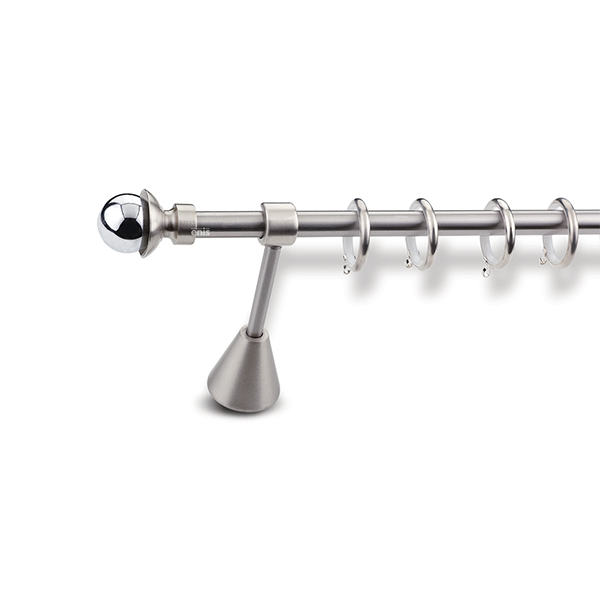 Μεταλλική ανοξείδωτη κουρτινόβεργα Enis Ματ Νίκελ ή Αντικέ, Πιάτο Σφαίρα σε μονή βέργα διαφόρων διαστάσεων. Η διάμετρος της βέργας είναι Ø16mm και περιλαμβάνει έως 3 στηρίγματα ανάλογα με την διάσταση.