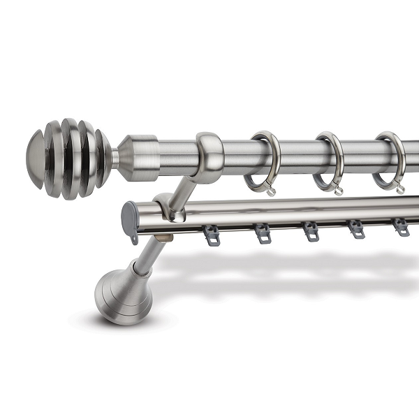 Μεταλλική ανοξείδωτη κουρτινόβεργα Enis Ματ Νίκελ, Πίνδος σε διπλή με σιδηρόδρομο 47106 σε διάφορες διαστάσεις. Η διάμετρος της βέργας είναι Ø25mm και περιλαμβάνει έως 3 στηρίγματα ανάλογα με την διάσταση.