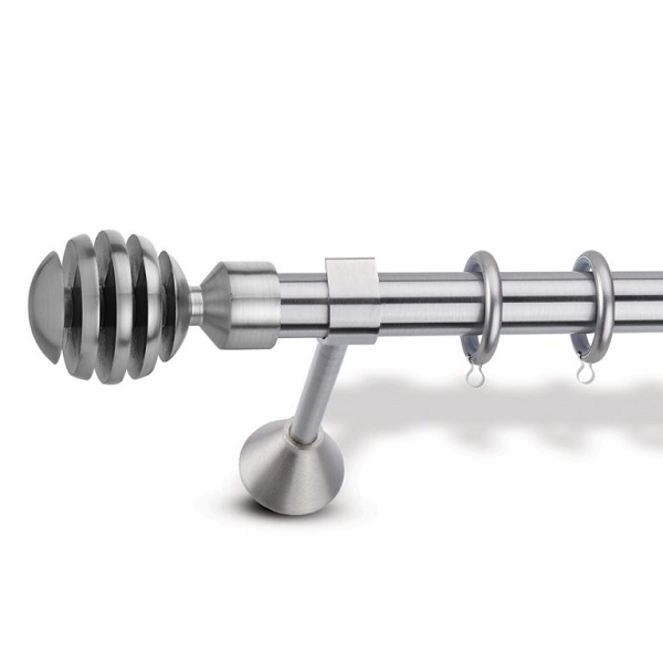 Μεταλλική ανοξείδωτη κουρτινόβεργα Enis Ματ Νίκελ, Πίνδος σε μονή βέργα, διπλή βέργα ή διπλή με σιδηρόδρομο σε διάφορες διαστάσεις. Η διάμετρος της βέργας είναι Ø25mm και περιλαμβάνει έως 3 στηρίγματα ανάλογα με την διάσταση.