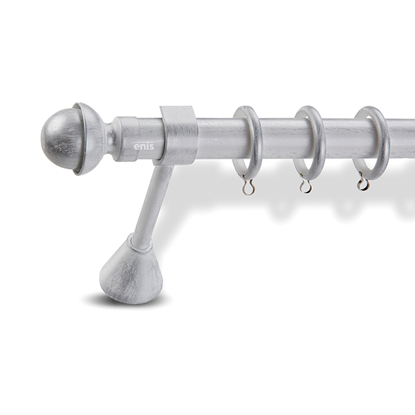 Μεταλλική κουρτινόβεργα Enis Πιάτο Σφαίρα σε μονή βέργα, διπλή βέργα ή διπλή με σιδηρόδρομο σε διάφορες διαστάσεις. Η διάμετρος της βέργας είναι Ø25mm και περιλαμβάνει έως 3 στηρίγματα ανάλογα με την διάσταση.
