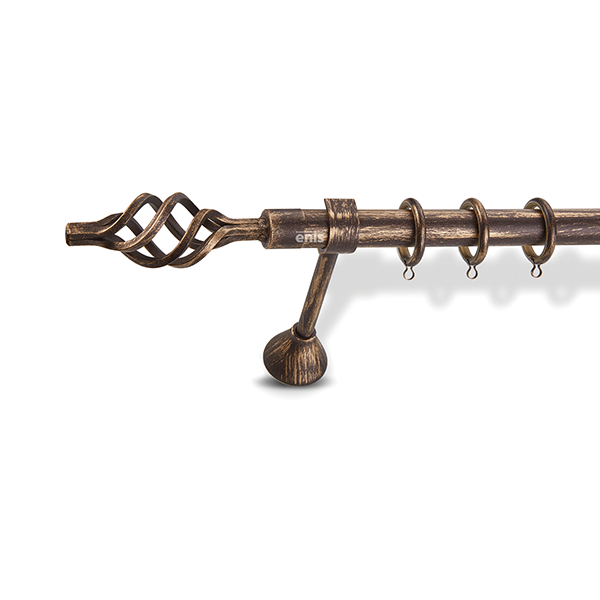 Μεταλλική κουρτινόβεργα Enis Πλεκτό σε μονή βέργα, διπλή βέργα ή διπλή με σιδηρόδρομο σε διάφορες διαστάσεις. Η διάμετρος της βέργας είναι Ø25mm και περιλαμβάνει έως 3 στηρίγματα ανάλογα με την διάσταση.