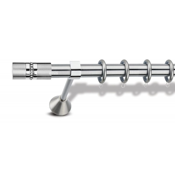 Μεταλλική ανοξείδωτη κουρτινόβεργα Enis Ματ Νίκελ/Χρώμιο, Πόρος Strass σε μονή βέργα, διπλή βέργα ή διπλή με σιδηρόδρομο σε διάφορες διαστάσεις. Η διάμετρος της βέργας είναι Ø25mm και περιλαμβάνει έως 3 στηρίγματα ανάλογα με την διάσταση.